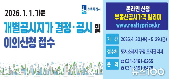 뉴스100 김동초 기자 | 수원시 권선구는 4월 30일 결정·공시되는 개별공시지가에 대해 4월 30일부터 5월 29일까지 이의신청을 접수한다고 밝혔다.