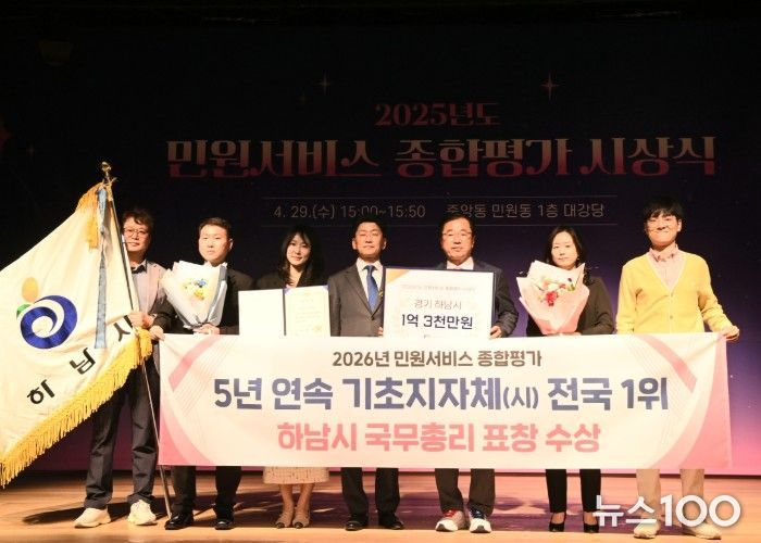 뉴스100 김동초 기자 | 하남시가 전국 기초자치단체 중 최고 수준의 민원서비스 역량을 인정받으며 5년 연속 최우수 기관으로 선정됐다. 하남시는 29일 정부세종청사에서 열린 ‘2025년 민원서비스 종합평가’ 우수기관 시상식에서 국무총리 표창을 수상했다고 밝혔다.