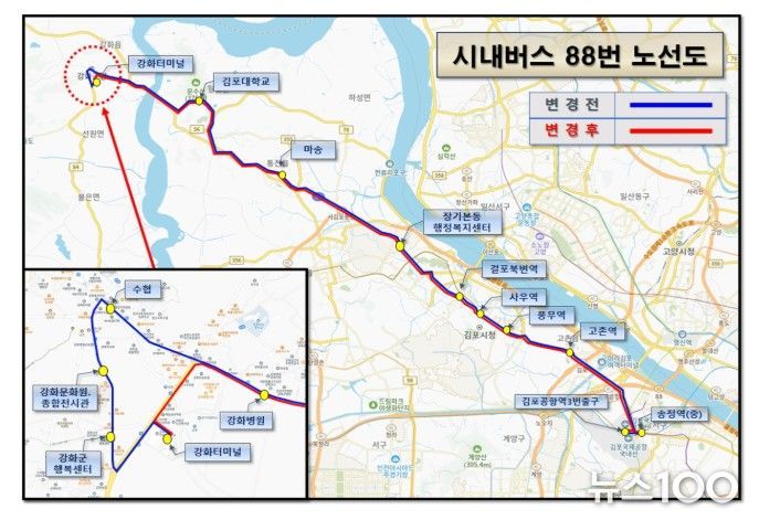 뉴스100 김동초 기자 | 김포시가 5월 1일부터 시내버스 88번 노선의 강화군 구간을 변경 운행한다고 밝혔다.