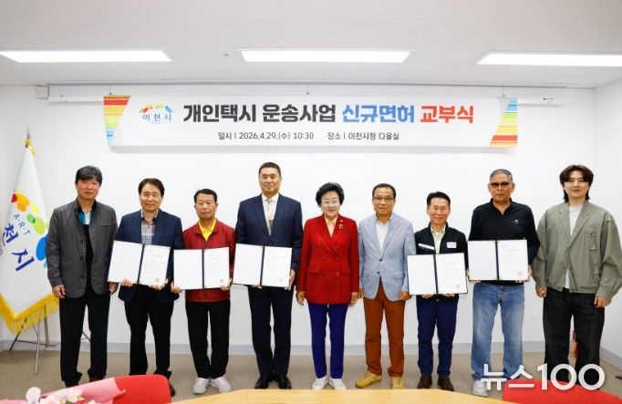 뉴스100 김동초 기자 | 이천시는 29일 시청 다올실에서 개인택시운송사업 신규 면허증 교부식을 개최하고, 심사를 통해 최종 선정된 5명의 대상자에게 면허증을 전달했다고 밝혔다.
