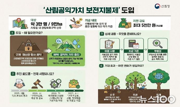 뉴스100 김동초 기자 | 산림청은 산림보호구역으로 지정돼 공익에 기여하고 있지만 산림경영에 제한을 받거나 임업직불금 수급 대상에서도 제외됐던 산주를 지원하기 위해 만든 ‘산림공익가치 보전지불제’ 도입을 위한 ‘산림보호법’ 개정안이 23일 국회 본회의에서 통과됐다고 밝혔다.