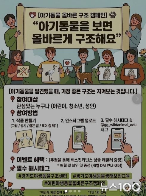 경기도는 어린이를 대상으로 시행하는 ‘야생동물 생태보전교육’에서도 자칫 납치가 될 수 있는 야생동물 구조에 대한 내용을 교육하고 있다. 또 ‘아기동물을 보면 올바르게 구조해요’라는 캠페인을 병행해 미래 세대가 야생동물의 생태적 특성을 이해하고, 인위적 개입을 줄여 자연과 공존하는 삶을 영위할 수 있도록 지속적으로 노력하고 있다.