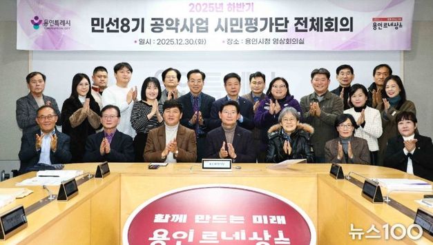 뉴스100 김동초 기자 | 용인특례시는 30일 오후 시청 영상회의실에서 ‘2025년 하반기 민선 8기 공약사업 시민평가단 전체회의’를 열고 공약사업 추진 현황을 점검했다고 31일 밝혔다. 회의에는 이상일 시장을 비롯해 도시건설·교육문화·경제환경·행정복지 등 4개 분과 시민평가단 위원 30여 명이 참석했다. 이상일 시장은 인사말에서 “올 한 해 정말 많은 일들이 진행되는 가운데, 시민평가단 여러분께서 공약사업을 꼼꼼히 평가하고 이행 상황을 점검해 주셔서 감사드린다”며 “지난 3년 6개월 동안 많은 일들을 해 온 만큼 앞으로도 부족한 부분은 더 보완해 나가겠다. 평가단 여러분의 많은 가르침과 조언 부탁드린다”고 말했다. 이번 회의에서는 2025년 12월 말 기준 민선 8기 공약사업 212건 가운데 185건(87%)이 완료됐고, 27건은 추진 중인 것으로 보고됐다. 전체 공약의 평균 이행률은 95%에 달한다. 이 시장은 원활히 추진되고 있는 사업은 현재의 속도를 유지해 차질 없이 진행하도록 하고, 진행이 더딘 사업에 대해서는 부서 담당자에게 구체적인 설명을 요구했다. 이 시장은 설명을 들은