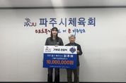 뉴스100 김동초 기자 | 파주가 낳은 배구 인기인(스타)이자 아이비케이(IBK)기업은행 알토스 소속 이주아 선수가 고향 후배들을 위해 1천만 원을 기부하며 남다른 고향 사랑을 전했다. 파주시체육회는 지난 23일 체육회 회의실에서 이주아 선수와 부모, 파주시배구협회 관계자(박희수 회장, 황우연 부회장, 전찬혁 사무국장) 등이 참석한 가운데 기부금 전달식을 개최했다. 이번에 전달된 기부금은 파주 지역 생활체육 활성화를 비롯해 유소년 및 학생 선수 육성, 체육 기반 시설 개선 등 파주시 체육 발전을 위한 다양한 사업에 사용될 예정이다. 이주아 선수는 “고향 파주에서 많은 응원과 도움을 받으며 운동을 시작했고, 덕분에 지금의 자리까지 올 수 있었다”라며, “지역 체육 발전과 후배 선수들에게 작게나마 힘이 되고자 기부를 결심하게 됐다”라고 소감을 밝혔다. 이어 “앞으로도 파주 체육이 더욱 활성화돼 꿈을 키우는 후배들이 더 나은 환경에서 운동할 수 있기를 바란다”라고 덧붙였다. 김종훈 파주시체육회장은 “파주 출신 국가대표 선수로 훌륭하게 성장한 이주아 선수가 고향을 잊지 않고 나눔을 실천해 준 데 대해 깊이