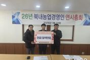 뉴스100 김동초 기자 | 여주시 북내면 후계농업경영인회는 지난 20일, 북내면 행정복지센터를 방문해 관내 어려운 이웃을 위한 이웃돕기 성금 100만 원을 전달했다. 이번 기탁은 회원들이 뜻을 모아 개최하는 연시총회를 앞두고, 지역사회의 소외된 이웃들이 따뜻한 새해를 맞이하기를 바라는 마음에서 진행됐다. 북내면 후계농업경영인회는 매년 잊지 않고 어려운 이웃을 위한 성금을 기탁하며 지역사회의 귀감이 되고 있다. 전달된 성금은 경기사회복지공동모금회를 통해 북내면 내 저소득층 및 복지 사각지대 가구를 지원하는 사업에 사용될 예정이다. [뉴스출처 : 경기도 여주시]