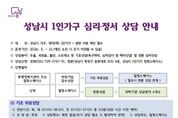 뉴스100 김동초 기자 | 성남시는 우울감이나 외로움, 불안감, 스트레스로 어려움을 겪는 1인 가구에 전문적인 심리·정서 상담을 지원한다고 5일 밝혔다. 이를 위해 최근 공모로 선정한 6곳 전문상담센터와 1인 가구 심리·정서 상담 수행에 관한 업무 협약을 했다. 협약한 상담센터는 △엠브레스 마인드 심리상담센터(분당구 구미동 소재) △온새미 심리상담센터(분당구 금곡동) △심리상담연구소 사람과 사람 위례점(수정구 창곡동) △㈜분당심리상담센터 아이엠미(분당구 야탑동) △속편한 심리상담센터(수정구 창곡동) △㈜마음꼭 차심리상담센터(분당구 야탑동)다. 이들 전문상담센터 이용 신청은 성남시 1인가구 힐링 스페이스(중원구 둔촌대로 100, 4층, ☏031-729-1756~9)나 거주지 동 행정복지센터 등에서 하면 된다. 성남시는 전문상담센터에서의 1인 가구 심리·정서 상담 지원을 위해 올해 5000만원의 사업비를 투입한다. 상담 지원 횟수는 최대 12회다. 1~8회 상담은 성남시가 비용(회당 4만~6만원)을 지원해 무료다. 나머지 9~12회 상담은 비용의 10%(4000~6