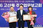 뉴스100 김동초 기자 | 의정부시 고산동주민센터는 1월 22일 주민센터 2층 다목적실에서 ‘2026년 주요업무보고회’를 개최했다. 이번 보고회는 ‘주민과 함께 만드는 변화, 더 나은 고산의 내일’을 주제로 지역 주민과 내빈 등 100여 명이 참석한 가운데 2025년 추진 경과 및 2026년 중점 추진 사업을 주민과 함께 공유하기 위해 마련됐다. 행사는 주민자치센터 수강생의 식전공연을 시작으로 ▲새해 인사 및 덕담 ▲지역발전 유공자 표창장 수여 ▲주요 업무 보고 ▲주민과의 대화 순으로 진행됐다. 고산동장은 주요업무 보고를 통해 ▲고산동 신설 ▲물류센터 부지 공공주택 공급 전환 ▲대형유통시설 입접 관련 협약 ▲아이돌봄시설 클러스터 시범사업 ▲학생 통학버스, 똑버스 등 대중교통 개선 및 나눔주차장 조성을 통한 교통환경 개선 등 생활밀착형 사업의 추진 경과를 공유했다. 또, ▲디자인도서관 조성 ▲민락TG 우회도로 개설 ▲법조타운 조성 ▲고산지구 제3공영주차장 조성 ▲주민커뮤니티 공간 조성 ▲민관협력, 모두가 돌보는 온(on)마을 공동체 사업 등 2026년 진행 예정인 핵심 사업을 설명하며 주민과 함께 고