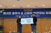 뉴스100 김동초 기자 | 남양주시는 지난달 31일 열린 ‘2025년 별내면 종무식’에서 별내면 기관단체장협의회가 지역 내 취약가구 지원을 위해 후원금 200만 원을 별내면 지역사회보장협의체에 기탁했다고 2일 밝혔다. 이번 후원은 한 해의 마지막을 뜻깊게 마무리하고, 지역사회 구성원 간 연대와 나눔을 실천하고자 마련된 자리에서 이뤄졌다. 기탁된 후원금은 향후 별내면 취약가구의 안정적인 생활 지원과 맞춤형 복지사업 추진에 활용될 예정이다. 장태식 별내면 기관단체장협의회 부회장은 “지역과 함께 나눔을 실천할 수 있어 뜻깊게 생각한다”며 “앞으로도 지역과 함께하는 상생하는 지역 공동체를 만들기 위해 최선을 다하겠다”고 말했다. 김혜연 별내면장은 “이번 종무식은 지역 기관과 단체가 한자리에 모여 올 한 해를 되돌아보고 새로운 출발을 다짐하는 의미 있는 자리였다”며 “앞으로도 일상 속 나눔이 자연스럽게 이어지는 별내면을 만들기 위해 함께 노력하겠다”고 밝혔다. [뉴스출처 : 경기도 남양주시]