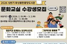 뉴스100 김동초 기자 | 화성특례시는 지난해 11월 3일 개관한 화성동탄중앙도서관에서 시민들이 다양한 독서·문화 활동을 즐길 수 있도록 2026년 상반기 문화교실 프로그램을 운영한다고 밝혔다. 이번 문화교실은 아동과 성인을 대상으로 총 10개 강좌로 구성됐으며, 연령별 특성과 관심사를 반영한 맞춤형 프로그램으로 운영될 예정이다. 아동 대상 강좌는 ▲동화책과 함께하는 창의독서아트(6~7세) ▲독서미술(초등1~3) ▲책과 함께 마음 한 걸음(초등1~3) ▲초등기자단: 신문으로 배우는 역사와 문화(초등4~6) ▲그림책이랑 통통통(6~7세) ▲서로 생각이 자라는 그림책(초등1~3) ▲디지털드로잉(초등4~6) 등이다. 성인 대상으로는 ▲내 목소리를 찾는 희곡 ▲그림에 머문 마음 한 조각 ▲이야기가 되는 내 일상 글쓰기 등으로 구성했다. 상반기 문화교실 1차 수강생 모집은 2월 19일, 2차 모집은 3월 20일부터 시작될 예정이다. 이와 함께 화성동탄중앙도서관은 시민 주도형 창작 활동을 지원하고, 시민 성장 중심의 독서문화 환경을 조성하기 위해 ‘메이크 북스(Make Books)’ 사업을 운영한