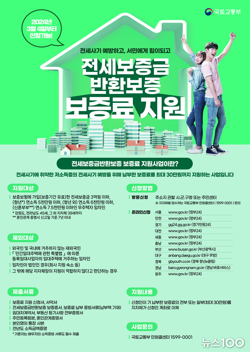 청년을 대상으로 전세보증금 반환보증료 지원을 해오던 국토교통부는 최근 전세 사기 등으로 임차인이 피해를 입는 사례가 늘어나자 대상을 전 연령으로 확대하고 소득요건도 완화했다.
