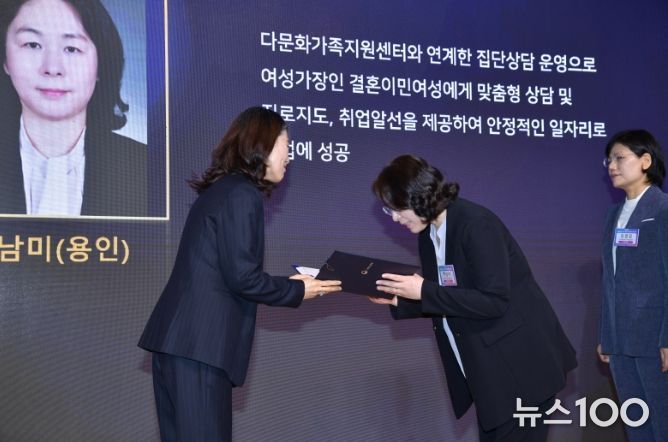 뉴스100 김동초 기자 | 용인특례시는 백남미 용인여성새로일하기센터 상담사와 스리랑카 출신의 이용자가 지난달 28일 서울 마포중앙도서관에서 열린 노동부·여성부 공동 주관 ‘제13회 여성새로일하기센터 유공 포상식’ 집단상담프로그램 우수사례 공모전 부문에서 최우수상인 고용노동부 장관상을 받았다고 4일 밝혔다.