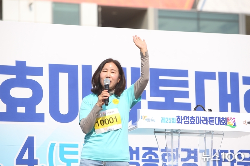 사진3)화성 효 마라톤대회에서 축사하는 김경희 의장