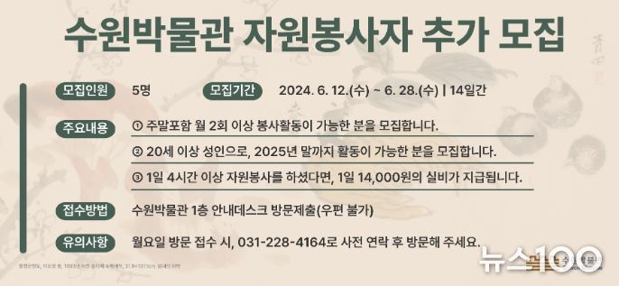 뉴스100 김동초 기자 | 수원박물관이 어린이체험실 운영을 도울 자원봉사자 5명을 26일까지 모집한다.