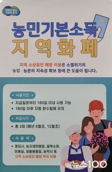 농민기본소득은 농민의 생존권을 보장하고 농업과 농촌의 공익적 가치에 대한 사회적 보상을 목적으로 지난 2021년부터 시행하고 있으며, 농민 개인에게 매달 5만 원씩 총 60만 원을 지역화폐로 지급한다.