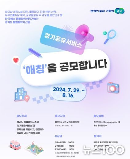 뉴스100 김동초 기자 | 경기도가 통합예약시스템인 경기공유서비스의 애칭을 다음 달 16일까지 공모한다.