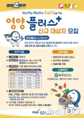 뉴스100 김동초 기자 | 파주시는 임산부 및 영유아를 대상으로 생활밀착형 영양관리 맞춤 서비스를 제공하는 영양플러스사업 신규 대상자를 연중 상시 모집한다.