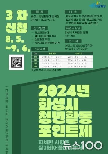 뉴스100 김동초 기자 | 화성시가 다음달 6일까지 ‘2024년 청년활동포인트제’ 적립신청 3차 접수를 받는다.