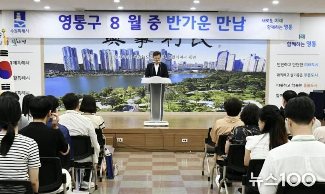 뉴스100 김동초 기자 | 수원시 영통구는 지난 7일 영통구 전 직원이 참여한 가운데 영통구청 대회의실에서 ‘8월의 반가운 만남’을 개최하였다.