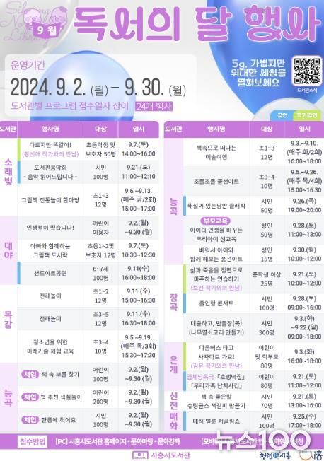 뉴스100 김동초 기자 | 시흥시 소래빛도서관을 비롯한 북부권 8개 공공도서관이 ‘9월 독서의 달’을 맞아 시민의 독서문화환경을 조성하기 위해 24개 다양한 행사를 운영한다.