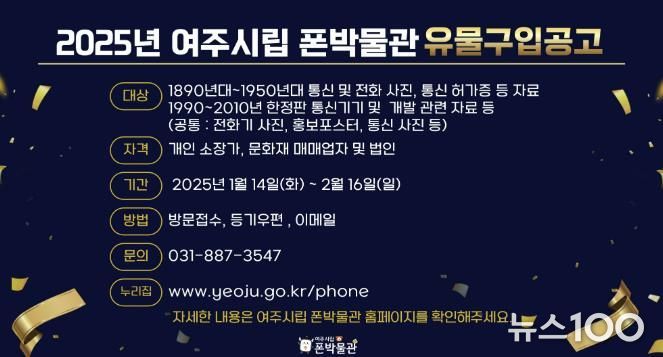 뉴스100 김동초 기자 | 여주시의 여주시립 폰박물관에서는 1980년대부터 1950년대의 통신 관련 자료와 1960년대부터 2010년대까지의 한정판 통신기기를 구입하기 위해2025년도 유물 공개 구입을 진행한다.