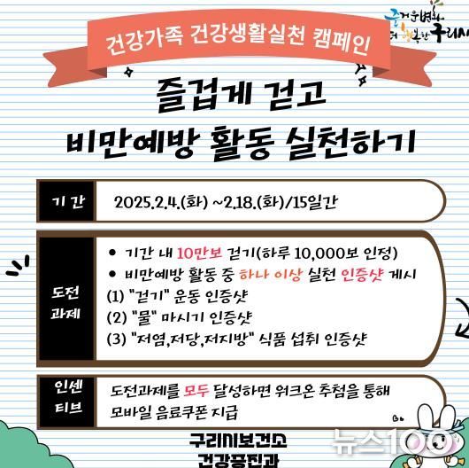뉴스100 김동초 기자 | 구리시는 건강가족 건강생활실천 챌린지의 하나로 ‘즐겁게 걷고 비만예방 활동 실천하기’를 운영한다.”라고 3일 전했다.