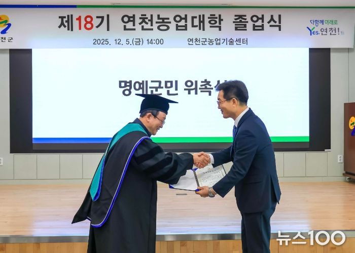 뉴스100 김동초 기자 | 연천군이 지난 5일 경기도농업기술원 성제훈 원장에게 명예군민증서를 수여했다.