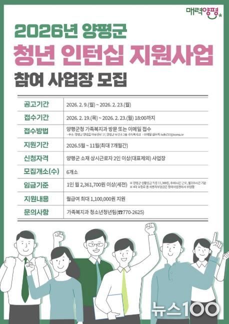 뉴스100 김동초 기자 | 양평군은 인력이 필요한 관내 사업장과 관내 거주 미취업 청년을 연계하고 사업장에 인건비를 지원하는 ‘청년 인턴십 지원 사업’ 참여 사업장을 오는 2월 19일부터 23일까지 모집한다.