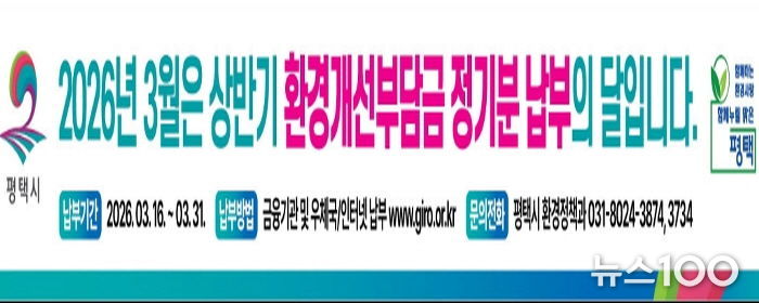 뉴스100 김동초 기자 | 평택시는 쾌적한 생활환경 조성과 환경개선사업 재원확보를 위해 2026년 1기분 환경개선부담금 정기분을 부과하고 체납액 집중 징수에 나선다고 밝혔다.