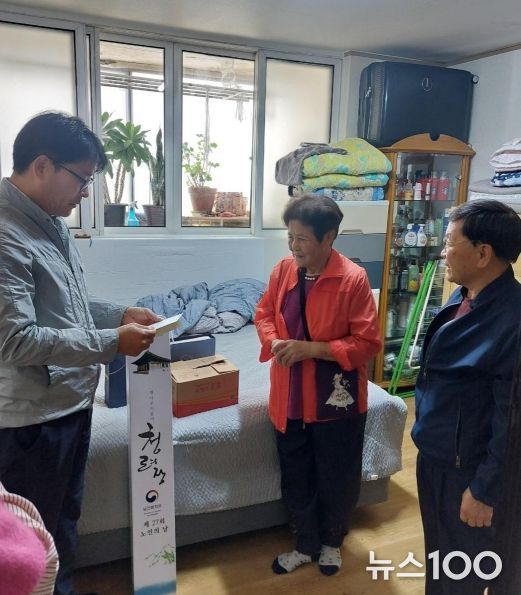 뉴스100 김동초 기자 | 파주시 조리읍은 11일 제27회 노인의 날을 기념해 100세를 맞은 관내 어르신의 가정에 방문해 ‘청려장(장수지팡이)’과 대통령 축하서한 및 실버경찰대에서 수확한 고구마 등 선물을 전달했다.