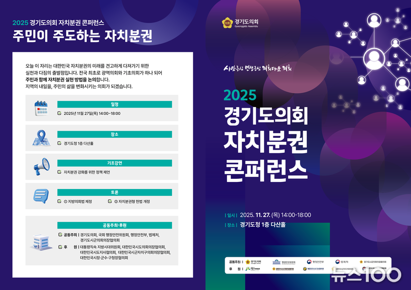 경기도의회(의장 김진경)가 진정한 자치분권 실현에 대한 사회적 공감대 확산과 향후 지방자치의 발전 방향 모색을 위한 「2025 경기도의회 자치분권 콘퍼런스」를 오는 11월 27일 목요일 경기도청 다산홀에서 개최한다.