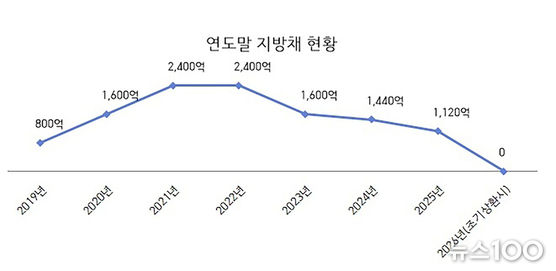 해당 지방채(2400억원)는 △2023년 1600억원 △2024년 1440억원 △2025년 1120억원으로 점차 줄었다.