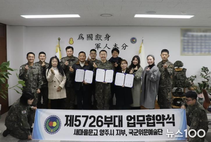 뉴스100 김동초 기자 | 새마을문고 양주시지부는 지난 12월 19일, 육군 제5726부대에서 군 장병들의 독서문화 확산과 인문학적 소양 증진을 위한 업무협약(MOU)을 체결했다고 밝혔다.