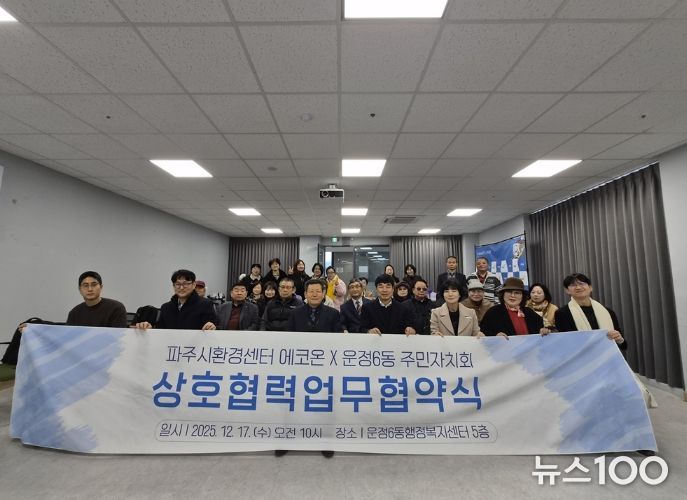 뉴스100 김동초 기자 | 운정6동 주민자치회는 12월 17일 오전 10시, 운정6동 행정복지센터에서 파주시환경센터 ‘에코온’과 ‘지역 환경 의제 실천 및 기후행동 협력을 위한 업무협약’을 체결하고, 이어 마을 소식지 '초롱꽃향기로' 2호 제작 성과공유회를 개최했다.