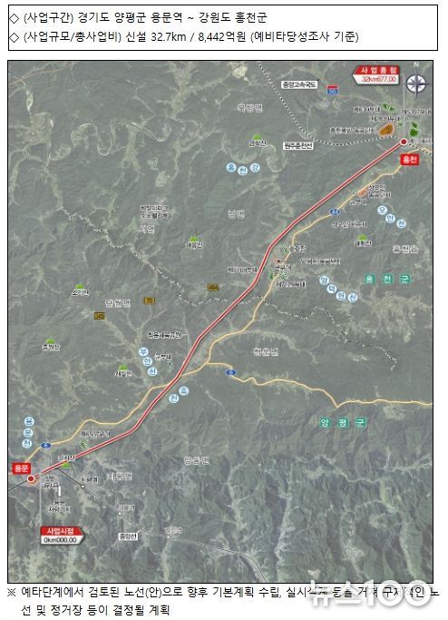 뉴스100 김동초 기자 | 국토교통부는 12월 22일 열린 재정사업평가위원회(기획재정부 주관)에서 용문~홍천 광역철도 건설사업이 예타를 통과하고, 증평-호법 등 2개 고속도로 확장사업이 예타 대상 사업에 선정됐다고 밝혔다.