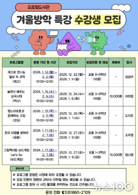 뉴스100 김동초 기자 | 동두천시 도서문화사업소 오르빛도서관은 겨울방학을 맞아 관내 초등학생이 다양한 주제를 흥미롭게 체험하며 사고력과 표현력을 키울 수 있는 겨울방학 특강 프로그램을 운영한다고 밝혔다.