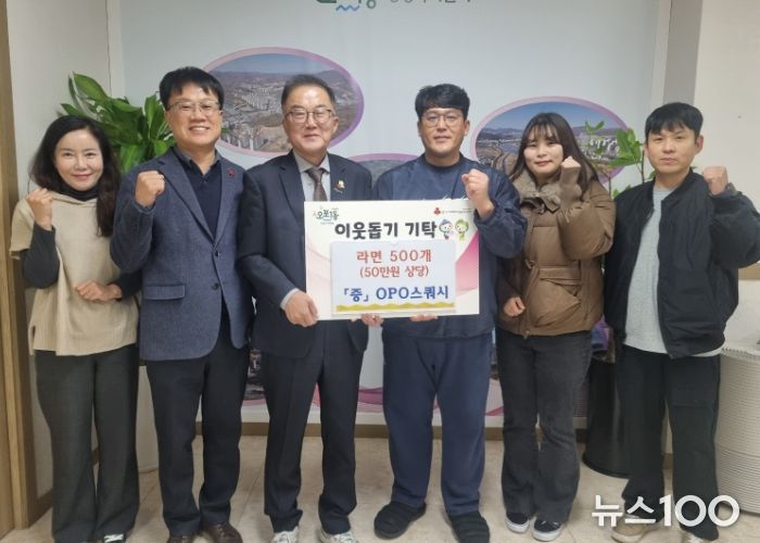 뉴스100 김동초 기자 | OPO스쿼시 강인석 대표는 23일 어려운 이웃에게 전달해 달라며 광주시 오포1동에 라면 500개(50만 원 상당)를 기탁했다.