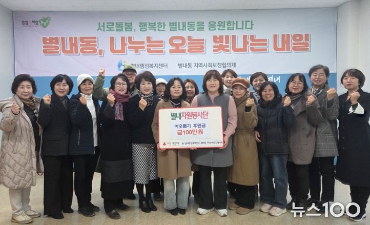 뉴스100 김동초 기자 | 남양주시는 지난 22일 별내동 자원봉사단이 지역 내 취약계층을 지원하기 위해 후원금 100만 원을 별내동 지역사회보장협의체에 기탁했다고 밝혔다.