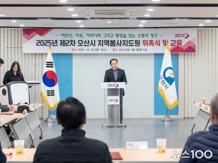 뉴스100 김동초 기자 | 오산시는 지난 23일 오산시청 물향기실에서 신규 경로당 회장을 대상으로 한 '2025년 지역봉사지도원 위촉식'을 개최했다고 밝혔다.