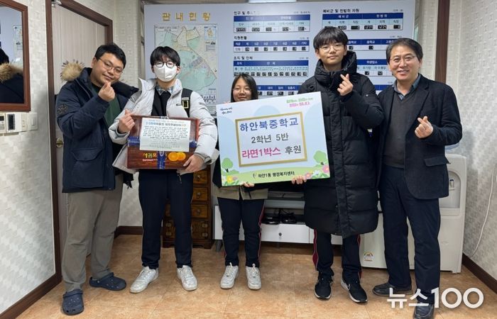 뉴스100 김동초 기자 | 광명시 하안북중학교 2학년 5반 학생들은 지난 24일 연말을 맞아 지역 내 어려운 이웃을 돕기 위해 ‘학생 1인 1라면 기부’ 활동으로 모은 라면 1박스를 하안1동 지역사회보장협의체에 전달했다.
