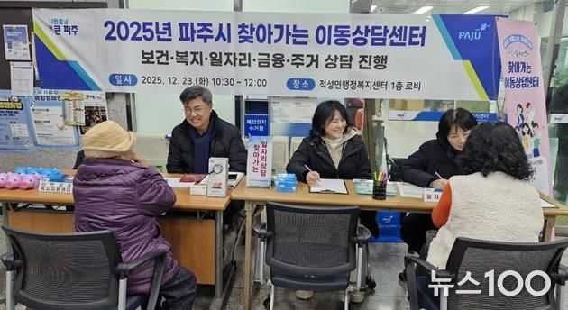 뉴스100 김동초 기자 | 파주시는 지난 23일 적성면 행정복지센터에서 정보 취약계층을 대상으로 보건, 복지, 일자리, 금융, 주거 등 5개 분야를 한자리에서 상담하는 ‘찾아가는 이동상담센터’를 운영했다고 밝혔다.