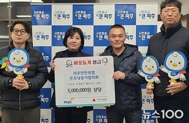 뉴스100 김동초 기자 | 파주시는 23일 파주연천축협 돈모닝농가협의회로부터 관내 저소득 취약계층을 위한 돼지고기 200kg(500만 원 상당)를 기탁 받았다고 밝혔다.