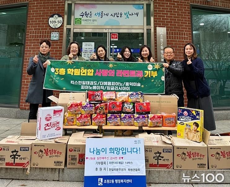뉴스100 김동초 기자 | 수원시 장안구 조원2동은 지난 24일 관내 한일타운주상가 학원 연합회로부터 어려운 이웃을 위한 라면 40개입 14박스를 기탁받았다고 전했다.