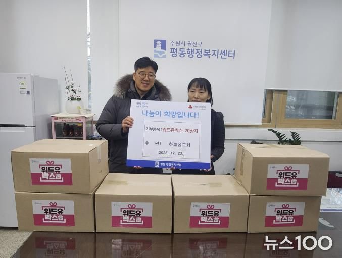 뉴스100 김동초 기자 | 수원시 권선구 고색동 소재 하늘성교회는 지난 23일 성탄절을 맞이하여 '위드유박스' 21박스를 평동 행정복지센터에 전달했다.