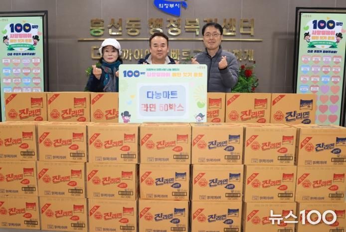 뉴스100 김동초 기자 | 의정부시 흥선동행정복지센터는 12월 24일 다농마트가 ‘100일간 사랑릴레이 배턴 잇기’에 동참해 라면 50상자를 기탁했다고 밝혔다.