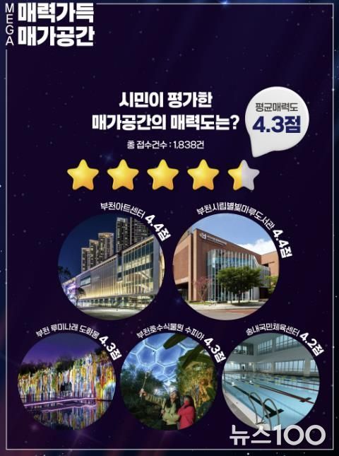 뉴스100 김동초 기자 | 부천시는 시민이 직접 참여한 ‘MEGA(매가) 공간’ 매력도 조사 결과를 발표했다. 이번 공모는 공간에 대한 시민의 체감도와 이용 경험을 파악하고, 이를 바탕으로 향후 공간 운영과 정책 방향을 설정하기 위해 실시됐다.