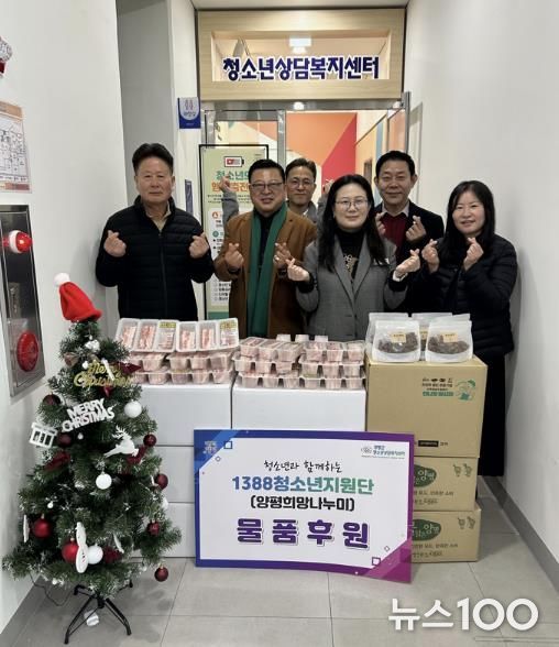 뉴스100 김동초 기자 | 양평군청소년상담복지센터는 지난 24일 1388청소년지원단으로부터 위기청소년을 위한 후원물품을 전달받았다고 밝혔다. 이날 전달식에는 임청우 단장과 양평 목우촌 문현길 대표가 참석해 돼지고기와 둥굴레차 세트 70개를 양평군청소년상담복지센터와 양평군학교밖청소년지원센터에 기부했다.