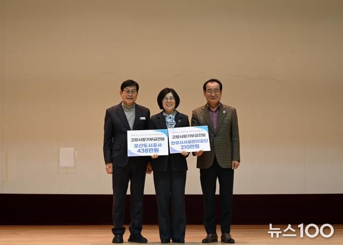 뉴스100 김동초 기자 | 안성시시설관리공단은 안성시와 오산시의 상생협력과 지역경제 활성화를 목적으로 안성시설관리공단과 오산도시공사가 중점적으로 추진한'고향사랑기부제 상호기부 전달식'을 개최했다고 밝혔다.