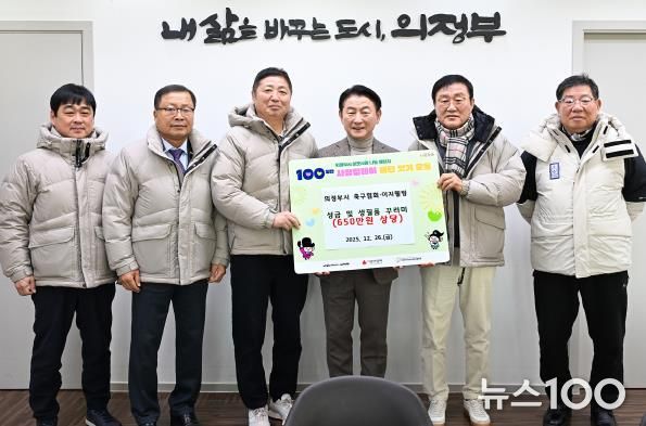뉴스100 김동초 기자 | 의정부시는 12월 26일 의정부시축구협회가 帤일간 사랑릴레이 배턴 잇기’에 동참해 성금 300만 원과 350만 원 상당의 생필품 꾸러미를 기부했다고 밝혔다.