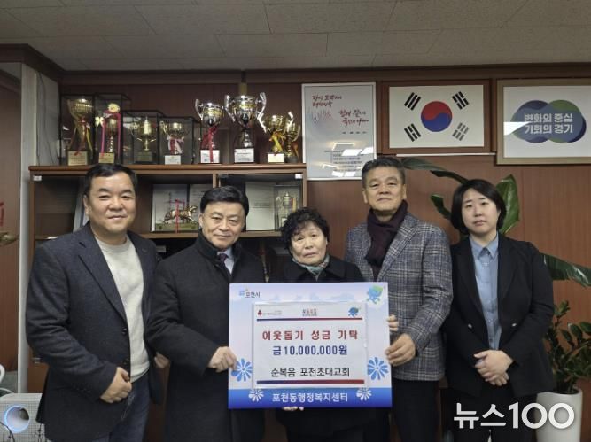뉴스100 김동초 기자 | 포천동 행정복지센터는 지난 29일, 순복음 포천초대교회에서 포천동 지역사회보장협의체에 성금 1,000만 원을 기탁했다고 밝혔다.