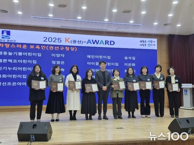 뉴스100 김동초 기자 | 권선구는 지난 29일, 어려운 여건 속에서도 헌신적으로 봉사해 온 어린이집보육교직원의 사기 진작을 위해 ‘자랑스러운 보육인’ 10명을 선정하여 권선구청장 표창을 수여했다.
